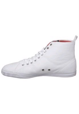 MARCEL from Lacoste. Summery light, it comes - the ankle-high bright white canvas sneaker, which impresses with its straightforward design! Spiced up only by the salmon-red foldable inner edge of the ankles as well as three discrete, the manufacturer, suggestive of crocodile applications, he speaks for himself quite otherwise. On the non-slip sole, it brings the wearer throughout the world. Sail away - with the sneaker from Lacoste MARCEL.